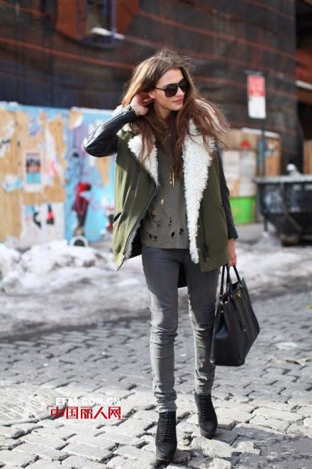 军装风大衣至酷有型,内搭的破洞毛衣很有随意的感觉,没有刻意的装饰就可以完美演绎街头秀了。