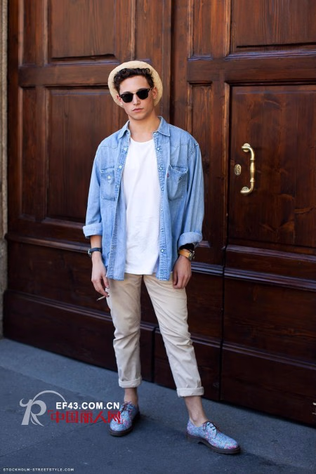 牛仔衬衫卷起袖口,卡其休闲裤卷起裤腿,就是这样的小心机打造了最潮最酷的英伦装扮。