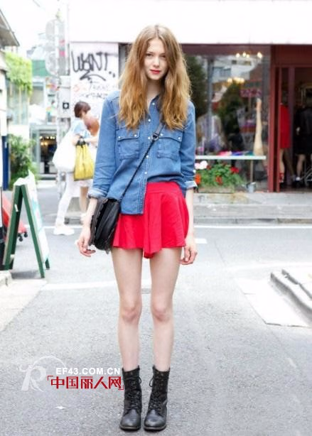身侧的牛仔同样也穿的很有味道,搭配红色小短裙,有意无意的包住衣边的衣角,MIX系带机车靴,不需要刻意,街拍感一步到位。