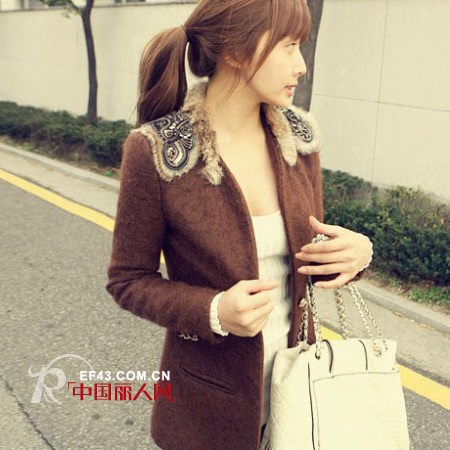 深咖色毛呢大衣是有点略显单调,但是加上了肩部华丽的配饰设计就立刻变得与众不同了,少许毛茸茸又让温暖感和时尚度瞬间升级。