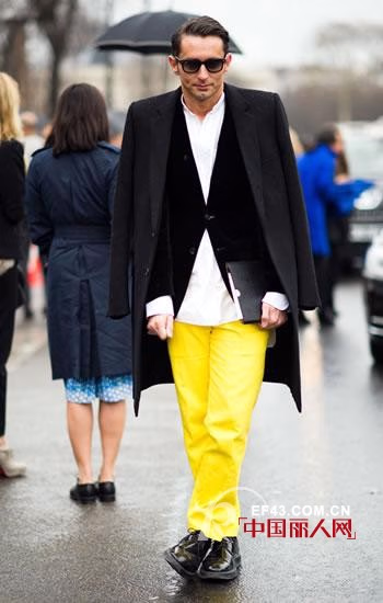 黑白灰总是男人们最最钟爱的色系,很多男性都会选择,但是型男告诉你,荧光色系也是魅力男的不错选择,亮黄色裤装高调出街,不惹眼才怪!