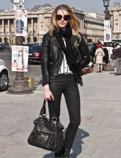 黑白竖条衬衫是亮点,机车风皮夹克和飘逸的围巾简单大方,黑超墨镜打造街拍女王。