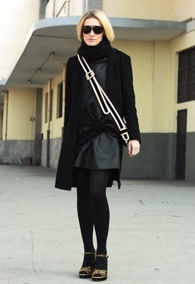 又是乱乱的搭配也是缔造美得一种方式,黑色装扮心机显瘦,金色凉鞋“夏装冬穿”,潮流感十足。