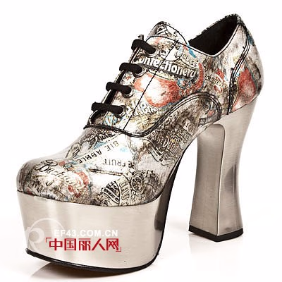 夸张造型的鞋跟和防水台可能是这款裸靴的最佳亮点,复古怀旧的鞋面图案增强时尚感。