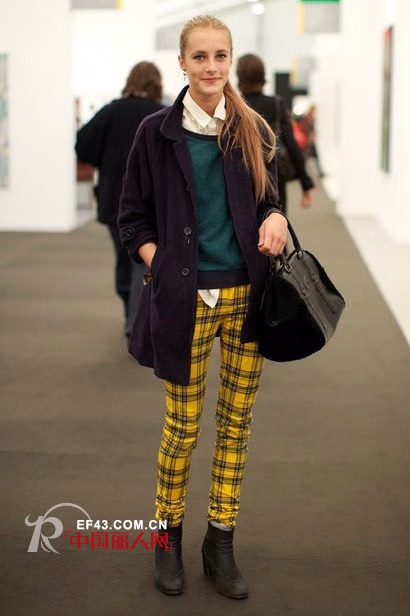 黄色格纹裤装一下子跳进摄影师的眼睛,成为街拍女王的必胜法宝,搭配祖母绿套头毛衫,欧美范儿一步到位。