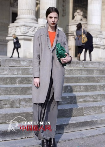 烟灰长裙搭配灰色大衣会显得很有沉重感,微微露出的橘色上装是个小心机,一下子让沉闷老气瞬间不见。