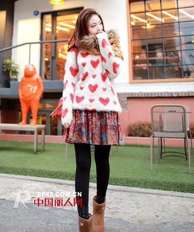 甜美可爱的心形毛绒毛衣,红色的桃心跃然灵动,穿出俏皮活泼的感觉,搭配印花小短裙,黑色裤袜,雪地靴,清新秀美,充满了淑女味道。