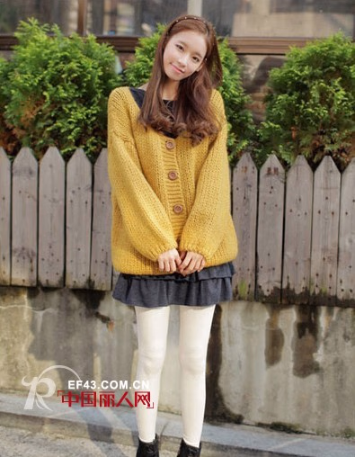 姜黄色毛衣外套,宽松蝙蝠款式,上身效果好,基本上不挑身材。清新抢眼的色彩,给人明媚多姿的感觉,内搭黑色裙摆式中长上衣,下穿白色打底裤,配上黑色短靴,不管是风格搭配还是色彩搭配十分温暖亲和。
