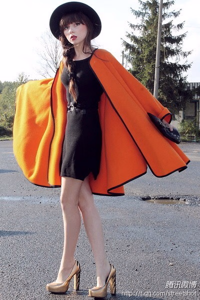 橘黄色披肩大衣,黑色的修饰边一下子抓住路人的眼球,如此高调的装扮你敢穿么?