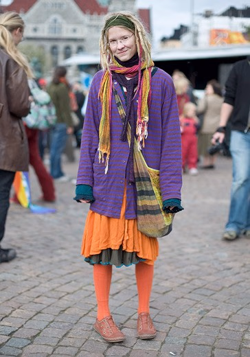 如此雅痞的装扮是不是顿时抓住了你的实现呢?随意简单的混搭,紫色上衣和橘色露边褶皱裙完美契合!