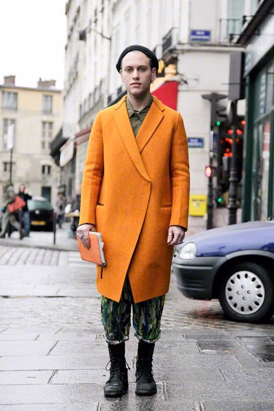 男人穿着橘黄色一样帅气十足,搭配迷彩卷边阔腿裤和马丁靴,丢掉刻意,细节凸显时尚感!