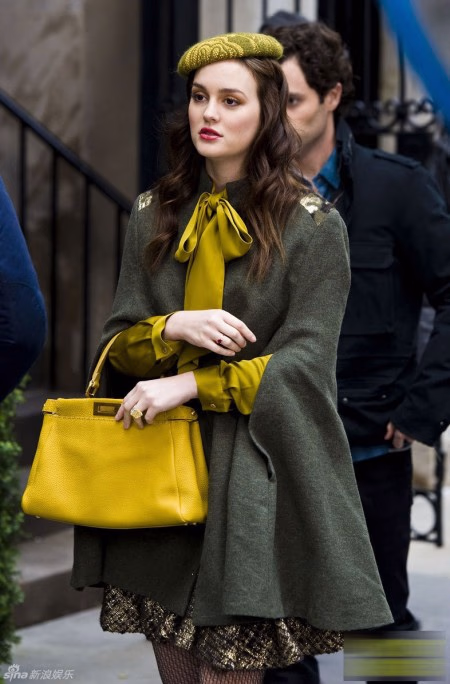 莉顿梅斯特的军绿斗篷,肩部金色亮片的设计更是锦上添花,搭配黄色反季节色调,大牌完美现身!