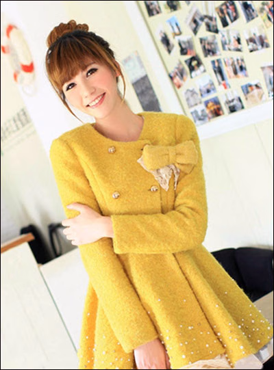 韩版亮黄色呢子大衣,设计非常精美。金色的双排扣熠熠生辉。蝴蝶结,钉珠镶面 ,非常清甜可爱的一款美衣。采用今年很流行的裙式设计,内衬还有纺纱拼接,可 以搭配打底裤当做连衣裙来穿,很淑女呢。