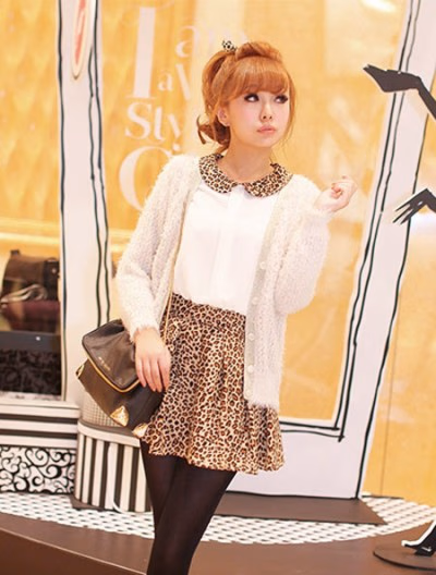 百搭A字型百褶短裙,简单的设计,打破豹纹纹样过于张扬的性格,遮住了你肉肉臀部,让小腿纤细完美展现。豹纹领子的上衣和裙子很搭,灰色的开衫营造出甜美可人的气氛。