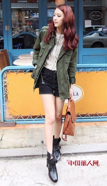 极简军装风风衣配以MM酒红色层次感强烈的头发,穿出了街头感十足的军装哦~