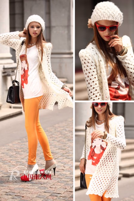 大镂空的针织外套,更显设计感,长款的设计有效地遮掩PP,半透的质地显出身材的轮廓。松松垮垮的浅色针织外套,内搭配一件可爱的T恤,穿上一条糖果色休闲紧身裤,气质MM立刻诞生,很有休闲范。戴上一顶同色系针织帽,迎合了叠穿的搭配原则,显出小女生的俏皮可爱。镂空针织外套的纽扣可随心扣起或打开,让你的穿搭彻底告别单调。