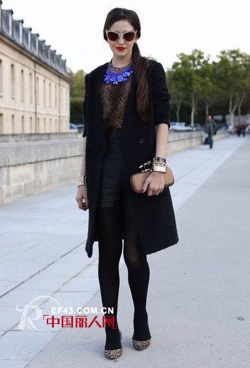 大气又时尚的黑色中款大衣搭配金属色泽咖色内搭衫的组合霸气十足。同色系的墨镜、配饰与豹纹平底鞋不仅提升了整体时尚度,还体现了极佳的整体感。一件亮眼的蓝色项饰更是点亮了整体装扮的色彩感。