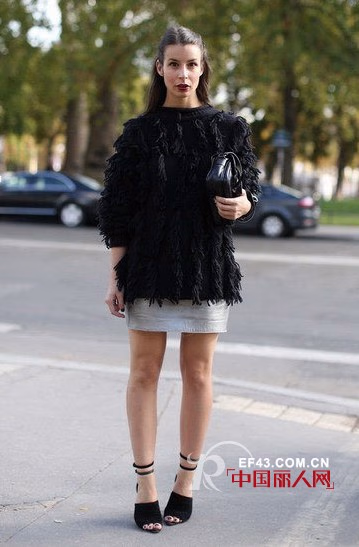 宽松的黑色针织流苏毛衣搭配修身小短裙,造型十分前卫。上宽下窄的穿搭方法在带出休闲的慵懒感之余仍能凸显修长的双腿线条。