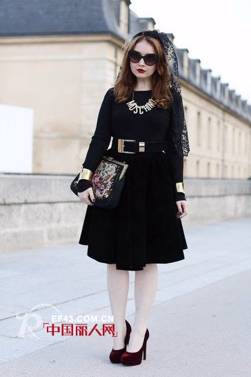 以略显夸张的黑色蕾丝作为头饰搭配黑色连身洋装,有着强烈的吸睛效果。金属色泽的配饰与红色丝绒高更鞋,更是为整体装扮增添了一份复古之感。