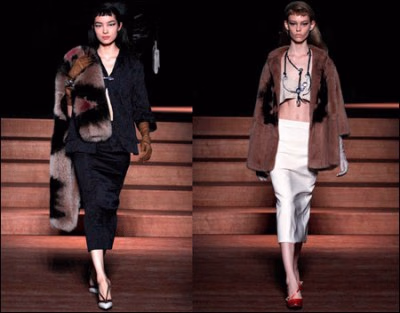 Miuccia Prada将华丽的面料以切割或扎染的方式破坏,在旗袍般修身剪裁的丝绸连身裙上,装饰星云爆炸般风格大胆的印花,看上去颇有50年代抽象艺术的风格;以高级定制的全丝硬缎作里衬,让普通面料看上去就更高级;用过膝长甚至极踝的铅笔裙、摇摆的曳地长风衣、胸衣式七分上衣、皮质长手套、镶嵌莱茵石的珠宝,还有那些抽象印花皮草……