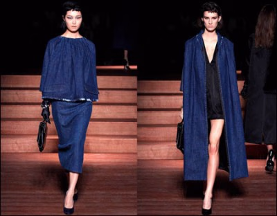 缪缪(Miu Miu)2013春夏女装秀以一系列深色丹宁面料的衣裳为开场,面料看上去虽廉价,却展现一种不同寻常的优雅阵容,形成一种50年代的年轻时尚风格。