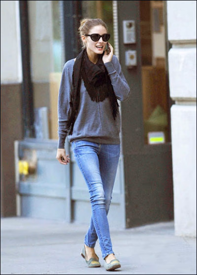 宽松的灰色套头衫,配上浅色的牛仔铅笔裤,没有什么特别与众不同的地方,只用围巾小小的装饰了一下。但是平底鞋还是十分考验美腿的哦。虽然被人们称作名媛,但她的穿衣打扮还是有很多值得年轻女孩借鉴的地方。