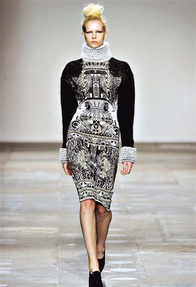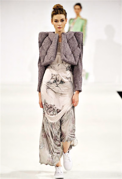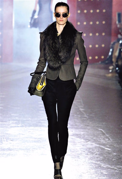 动物纹与上扬的垫肩一碰撞,必然是火辣到家,不过好在还有深紫的色调与木耳边平衡了优雅。
