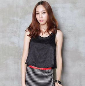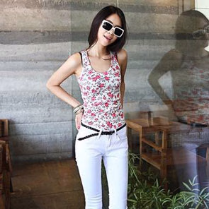 黑色的腰带一定是必备款式!充满女人味的碎花背心配上一条白色的窄脚裤,清新的感觉一定让你脱颖而出。黑色的腰带顿时增添了你干练而知性的气质,只是白色的长裤很挑人,腿部不甚纤细修长的MM还是避免尝试。