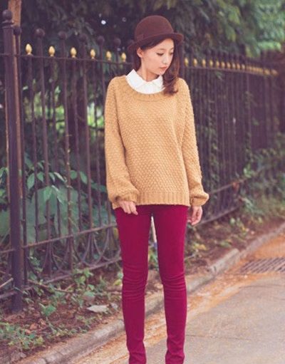 姜黄色宽松毛衣搭配深红色小脚裤,撞色搭配视觉抢眼,温婉的色彩,带点小清新的味道,毛衣内搭白色衬衫,这也是秋季经典的搭配,配上厚底单鞋,更显英伦范儿。