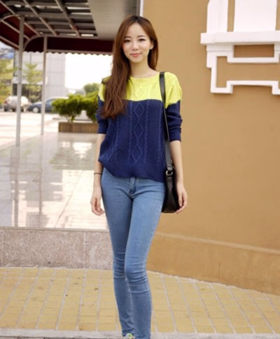 撞色毛衣搭配小脚裤,球鞋,很休闲舒服的装扮,简单大方,喜欢随性风的女生可以这样穿,很有小女人味呢。