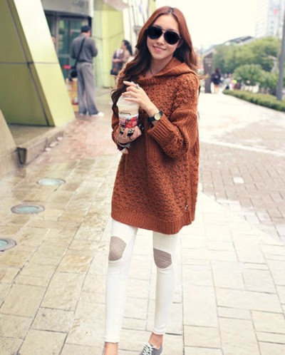 深咖色连帽毛衣,中长款版型,连帽款式,让这款毛衣更具时尚感,简单的搭配补丁打底裤,格外的舒服好看,更有型女范儿。