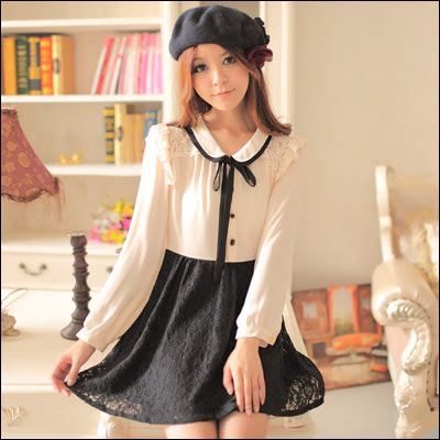 这款裙子的设计甜美可爱,非常的清新,在颜色的搭配上,裙身主要采用米色,领口是双层的,黑色从视 觉上强烈的撞击着人们眼球,给人一种惊艳的感觉,下摆的蕾丝拼接,更加突出了裙子的甜美主题哦~~衣服的领子是 双层的娃娃领设计,还有黑丝系带的哦~~由于选择韩国外单进口面料,所以面料手感非常好。