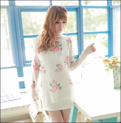 很美的玫瑰花朵针织 里面有亮丝噢 整款衣服比较清新时尚 外面搭一个外套也超级赞的。