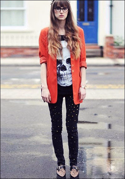 相比前面几款小西服,这款颜色上稍显暗了一些,但更加突显女性成熟、优雅的气质。为了摆脱沉闷气息,可以像她一样搭配一件骷髅头款的T恤衫。