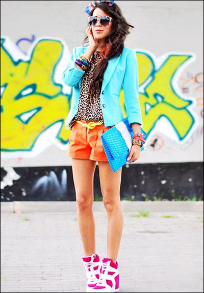 出街就是要穿得亮眼一点,才能成为焦点,亮蓝西服+橙色短裤+hot pink高帮鞋,你喜欢这样的欧美风搭配吗?