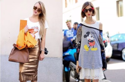 可爱的卡通图案T恤是打造可爱小女人风韵的必杀利器。如图左的达人,金属色的步裙、手挎的YSL棕色包包、橙黄色的外衣以及侧放的长发尽显成熟韵味,右图的达人身穿小清新挚爱的蕾丝背心裙,略显凉意的天气外搭露肩的米老鼠长袖T恤看起来顽皮又有活力。