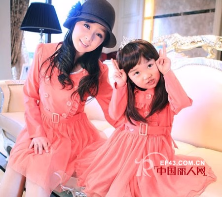 休闲拼纱风衣连衣裙亲子装,经典双排扣,褶皱花边优雅显气质!