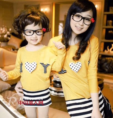 姜黄色蝴蝶长袖T恤裙亲子装,个性的蝙蝠袖,胸前的爱心超有型!