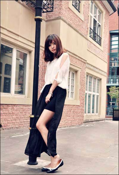 长裙独具风情魅力,一款黑色长裙,超有设计感,开叉和内衬短款的设计让这款长裙 更具T台味道,搭配白色露肩衬衫,性感时髦。