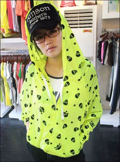 荧光黄连帽外套,鲜亮的色彩,骷髅头设计,个性十足。连帽款式休闲好看,而且能够遮住肩宽,看起来更娇小。搭配黑色哈伦裤就好。