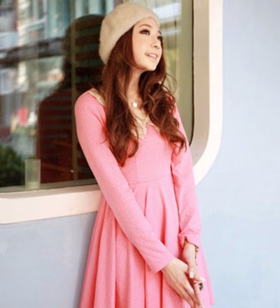 秋冬季,不少美眉对贝雷帽都情有独钟,它配上粉色长袖连衣裙,是不是使女孩更加的美丽、动人呢?