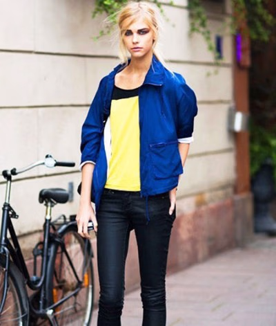 亚洲女孩喜欢蕾丝、蝴蝶结这些比较甜美的元素,而欧美人喜欢极简风格的单品。简约风的宝蓝外套,配牛仔就很时尚好看。
