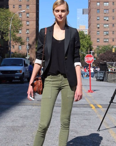 谈及外套配长裤的搭配,少不了秋季百搭圣品西装外套,这样黑色西装与军绿色工装裤的搭配,心水么?