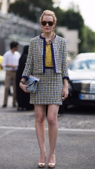 斜纹软呢套装:斜纹软呢套装的经典无需多言,今秋冬T台上,各大时装周更是铆足力,打破了Chanel一家独大的格局。早秋的短裙套装让优雅温婉的名媛气息尽情挥发,经典式时髦怎能错过?