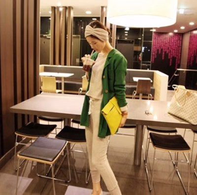 撞色搭配,鲜明的色彩冲击着视觉。明黄色的手拿包与绿色风衣的组合搭配,给人耳目一新的感觉。另外,下身这款抽绳高腰裤,也很适合高海拔的女孩子们,突显身材优势的最佳单品。