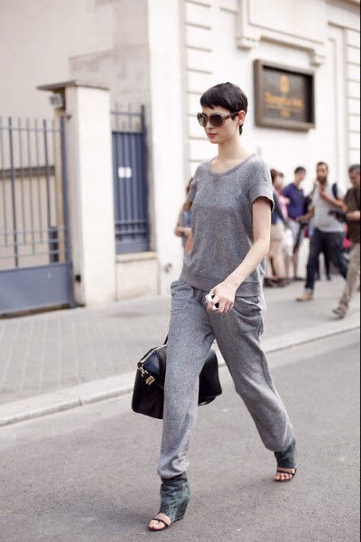 灰色运动风套装,毛圈材质不仅可以用在冬天,配合小男孩短发,可爱极了