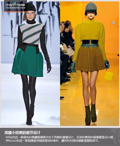 如果你拥有迷人的双腿,那就一定要大胆秀出来,即便是较为寒冷的秋冬,也可以穿上丝袜亮出美腿,高腰短裙不仅能够展现出双腿的迷人风姿,还能够进一步的帮你拉长腿部比例,Milly的这一条绿色的高腰短裙亮点在于两侧的褶皱设计,区别的常规的短裙更显设计感,而Kenzo的这一款短裙选用绒面质地的面料,腰间的材质拼接彰显精致细节。
