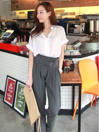 时尚百搭的休闲风格装扮,通过白色衬衫增强你的帅气时尚魅力,麂皮面料的哈伦裤十分适合夏末或者初秋搭配。加上裸色高跟鞋和裸色手包,经典时尚简约的风格立即显现。