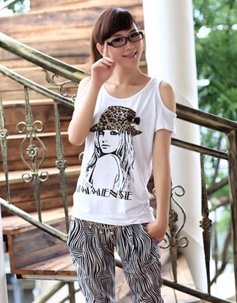 独特的漏肩设计,性感优雅。版型宽松,轻松随意有时尚!面料质地柔软,穿起来舒适自然。欧美人物头像,释放女人气质。