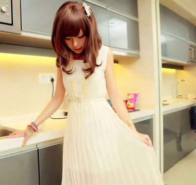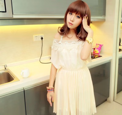 露肩蝙蝠袖连衣裙,百褶裙的裙摆,在里面搭配一件小吊带,方式走光哟!嘻嘻,性感中带点可爱,美美的出门约会去咯